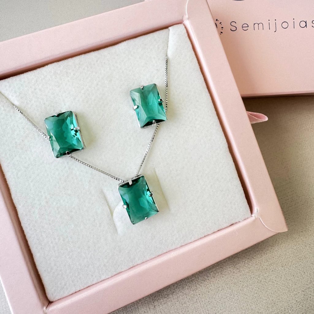 Encante-se com este lindo conjunto composto por um colar delicado e um par de brincos elegantes. Cada peça exibe uma linda pedra retangular na cor verde clara.